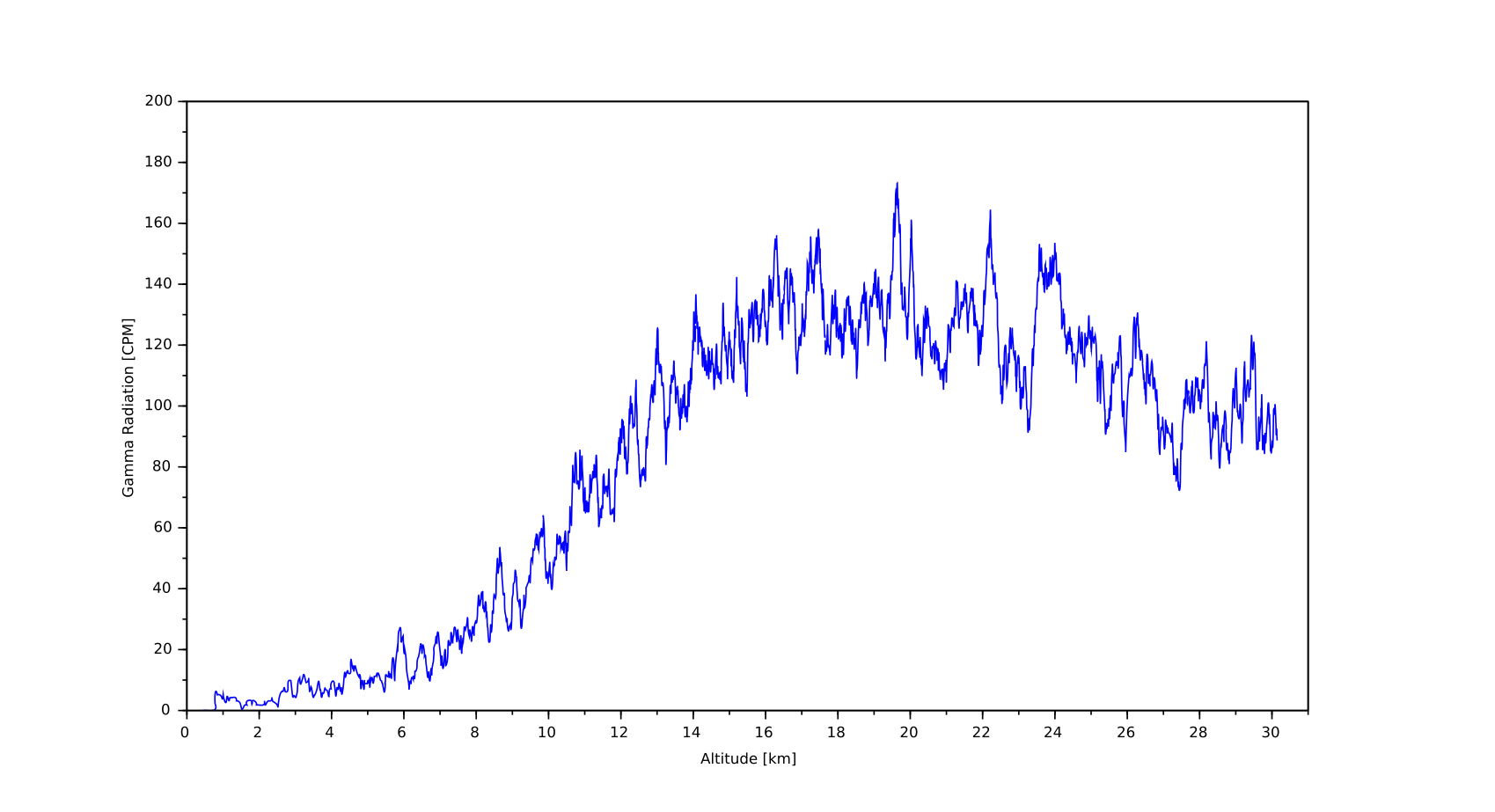 Werden am Boden nur ca. 3 CPM gemessen, sind es ab 20 km Höhe teilweise fast 180 CPM. Interessanterweise nehmen die Werte in grösserer Höhe wieder ein wenig ab. Wir vermuten, dass mit der Zeit Messungenauigkeiten auftreten. Es ist fraglich, ob das Zählrohr für einen Betrieb in einer so extremen Umgebung ausgelegt ist.